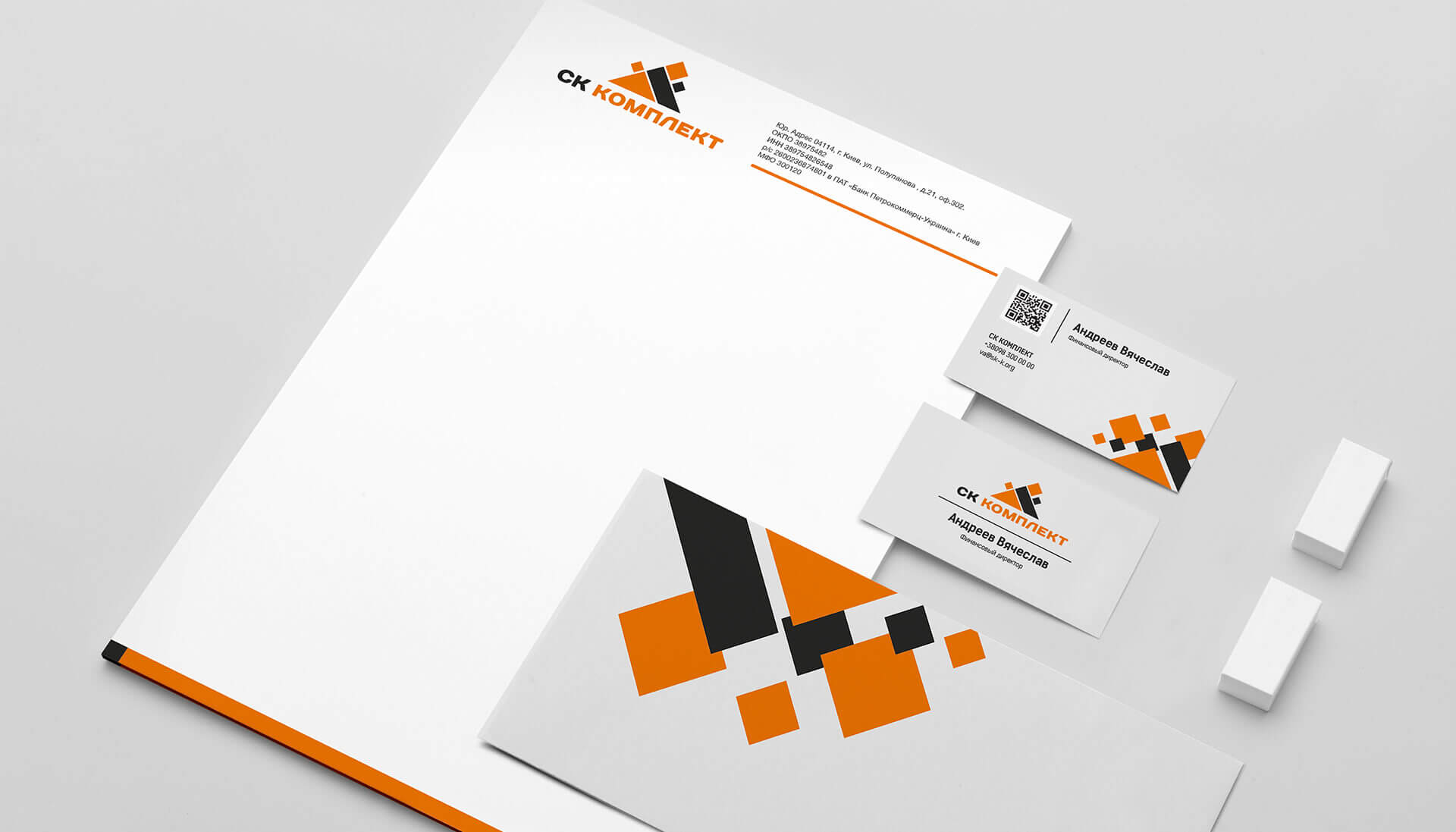 На основі абстрактного логотипу ми розробили головні елементи фірмового стилю конверти, бланки, візитні картки. Усі вони виконані в одному стилі. Скрізь використані частини абстрактного знака з айдентики у чорно-жовтогарячій гамі. Вийшов солідний та надійний візуальний імідж компанії, який став основою ділових партнерських відносин. Виконаною роботою замовник залишився задоволеним, а в портфоліо студії з’явився ще один успішний проект.
