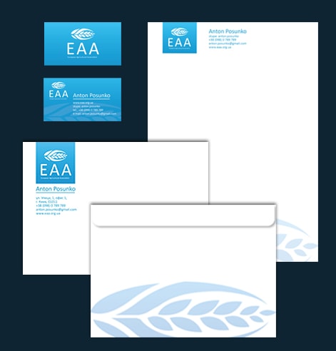 Ініціали та назва компанії виконано у простому, але досить солідному, шрифті. Весь логотип змальований білим кольором на яскраво-синьому тлі. Крім того, що це зморитися яскраво і помітно, блакитний колір уособлює чистоту та свіжість. Для Європейської Аграрної Асоціації ми розробили елементи фірмового стилю. В основу ліг створений нами логотип, який органічно виглядає на бланках, візитних картках та іншій документації компанії. Загалом робота над проектом видалася досить продуктивною, ми багато чого зробили, якісно оформили імідж компанії.