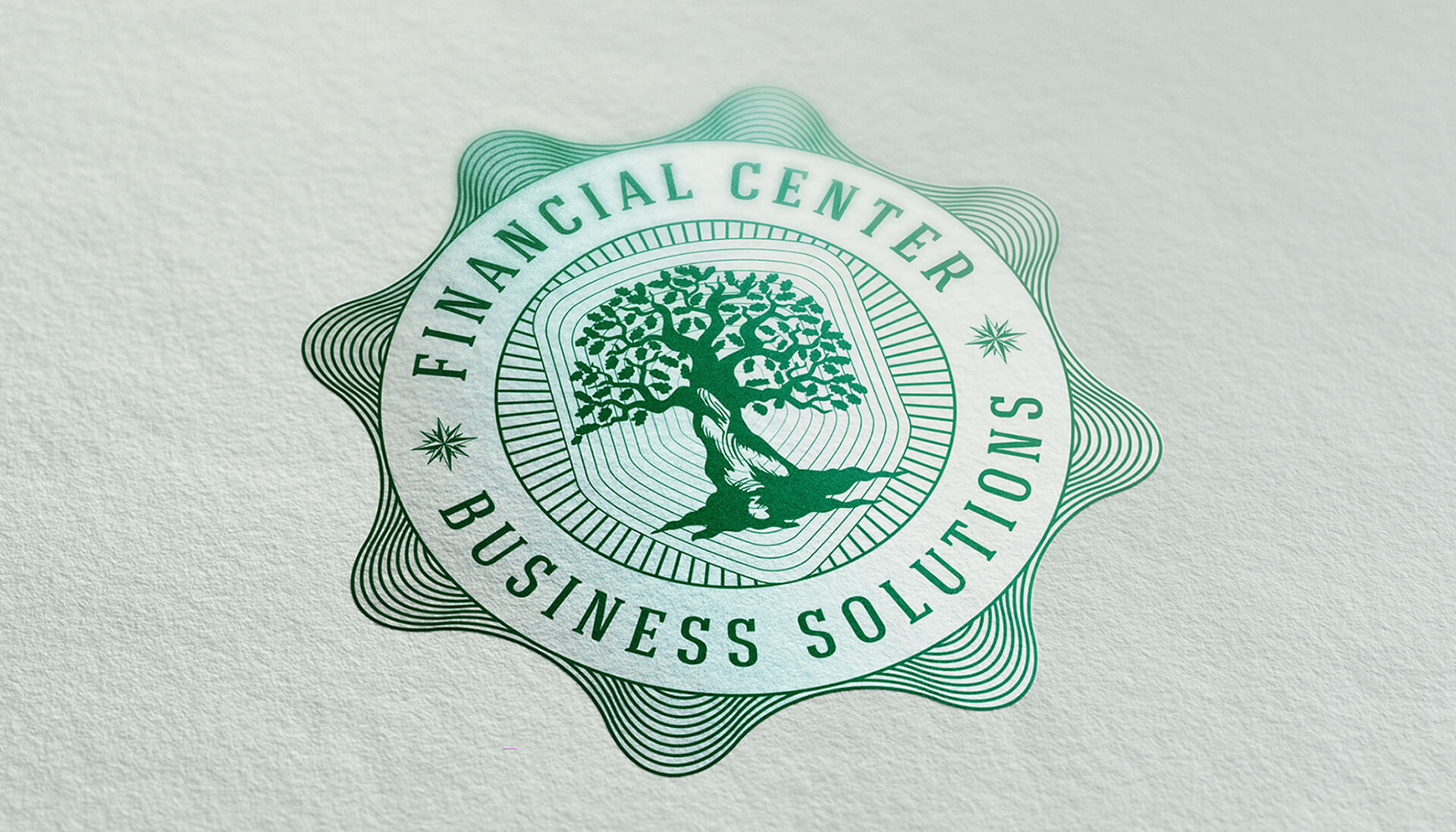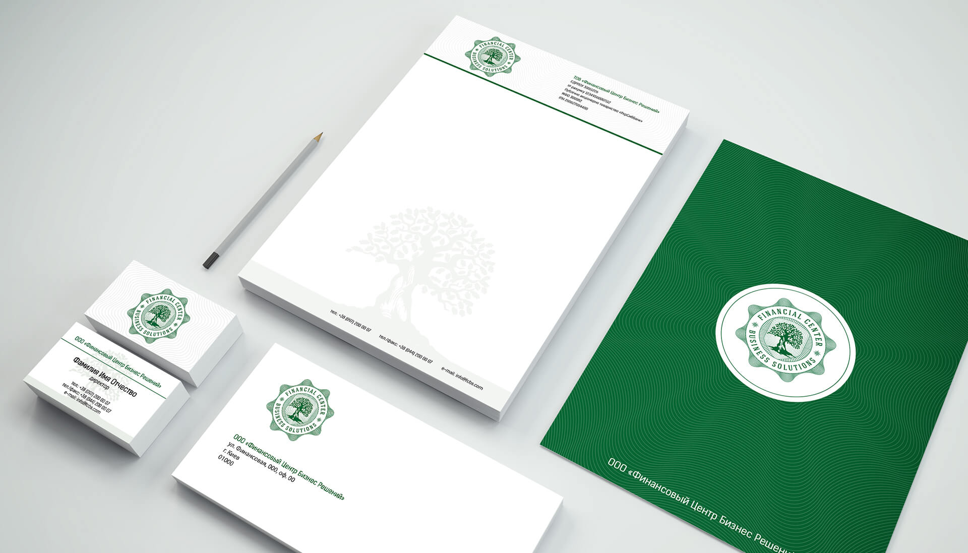 Особливе місце у розробці фірмового стилю зайняв сильний логотип фінансового центру у вигляді дерева. Знак проглядається на титульній сторінці візитної картки, роблячи цей елемент фірмового стилю унікальним та впізнаваним. На задній частині візитки зображений логотип у досить оригінальній манері. Вся необхідна інформація гармонійно помістилася на карті, тільки важливі дані та нічого зайвого, як і належить у діловій документації. В оформленні всіх елементів використано зелений відтінок – корпоративний колір центру. Всі елементи фірмового іміджу виконані в одному стилі, виглядають презентабельно, якісно та інформативно.