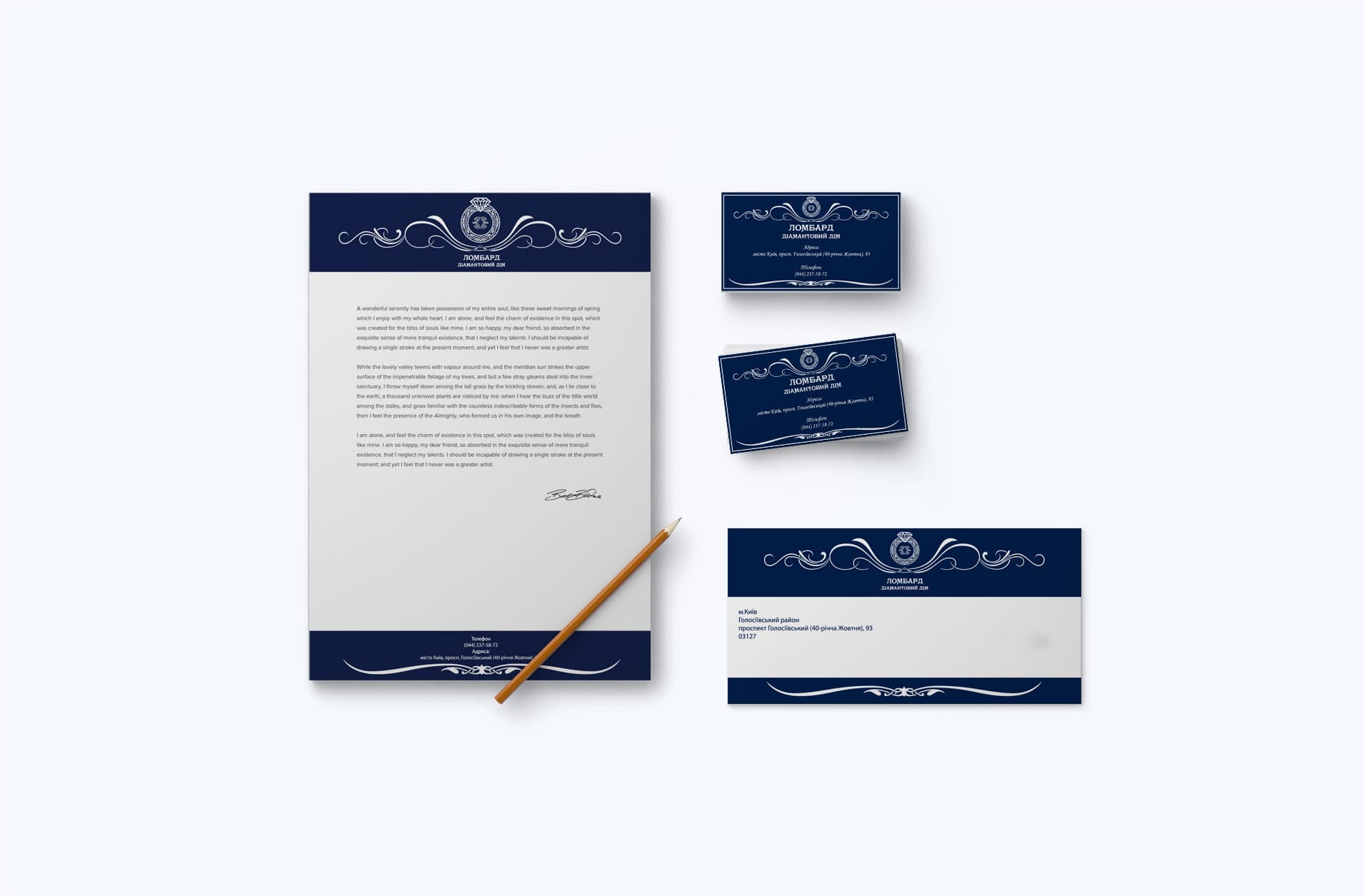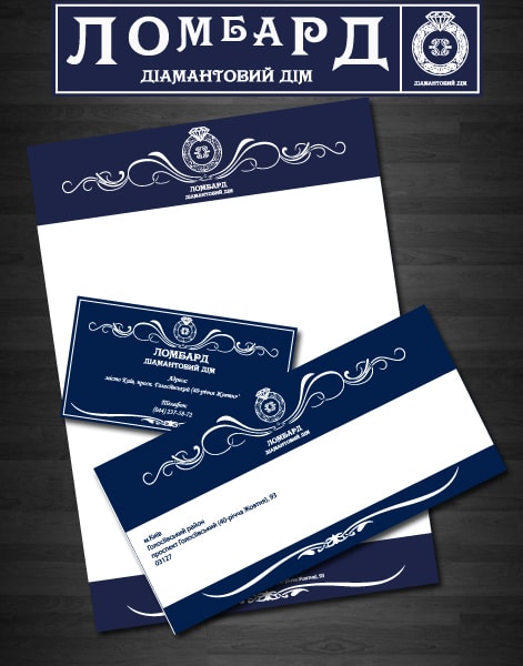 Крім логотипу, ми розробили фірмовий стиль для ломбарду “Діамантовий дім” та макети горизонтальної та вертикальної вивісок. Логотип органічно виглядає і на елементах фірмового стилю, і чудово прикрашає вивіски ломбарду та його філій.