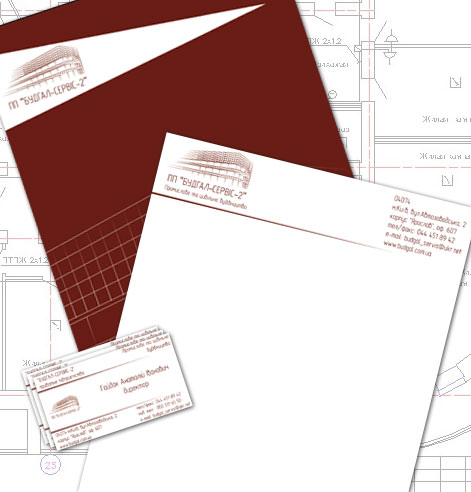 На основі фірмового знаку нашими дизайнерами було розроблено фірмовий стиль компанії. Малюнок на візитних картках та бланках є графічним зображенням будівлі. Корпоративним кольором було обрано коричневий. Елементи фірмового стилю вийшли ненав’язливими і такими, що вселяють довіру до компанії. Цього ми й досягали, проект завершено на успішній ноті.