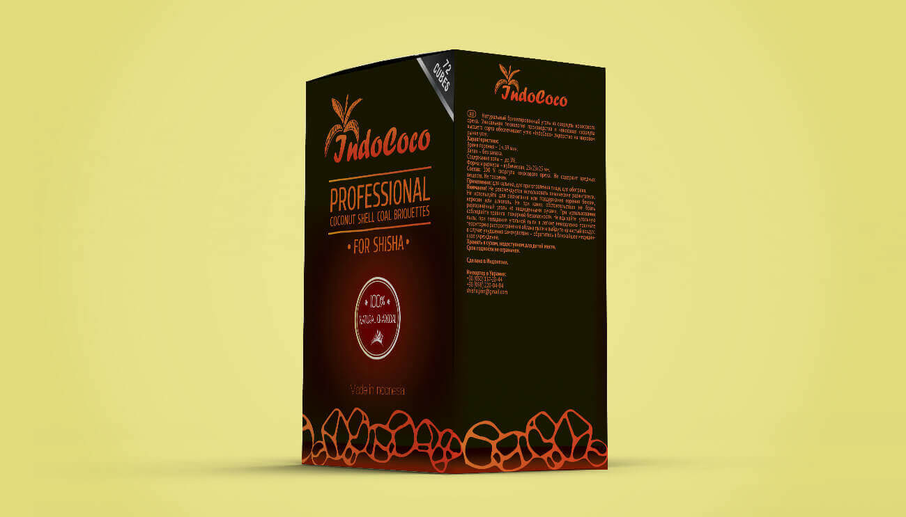 Много лет назад кальяны вошли в пользование, и остаются все также популярными. В связи с этим многие компании производят необходимые аксессуары для курения кальяна. Если компания хочет занять достойное место на данном рынке, то стоит выделяться и создавать яркий, запоминающийся и стильный имидж. В нашей студии разрабатывали дизайн упаковки для кокосового угля бренда IndoCoco. Заказчик поставил задачу создать стильную упаковку, которая бы подчеркивала особенности продукта и выделялась среди конкурентов, но при этом оставалась в рамках своей сферы.