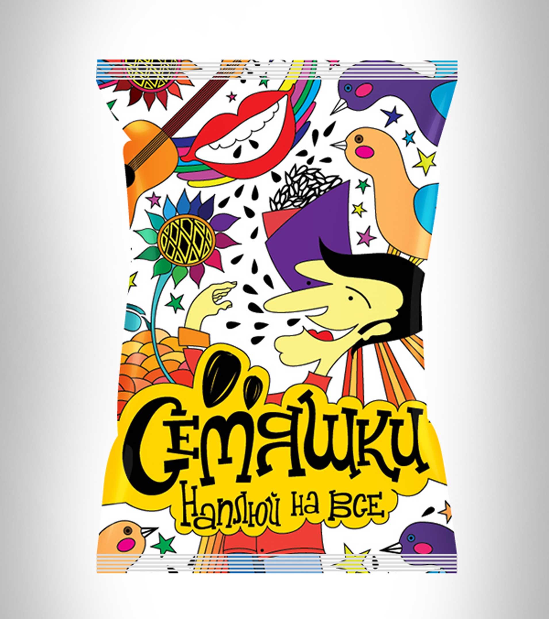 На основе понравившегося нейминга мы разработали несколько логотипов и предоставили их на выбор клиенту. Перед нами была поставлена цель — создать логотип, который бы дал мощный импульс продажи продукции, выделив ее среди конкурентов. Айдентика компании «Семяшки» получилась яркой, веселой и красочной, отлично подходит именно для этого продукта.