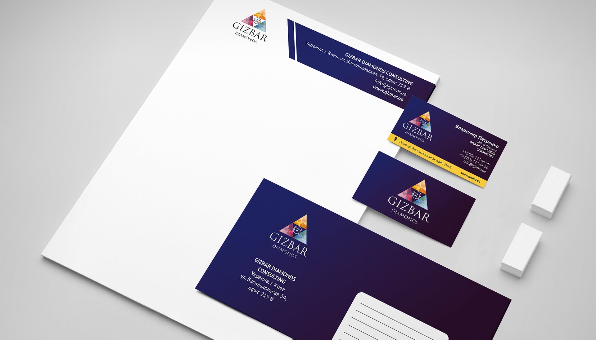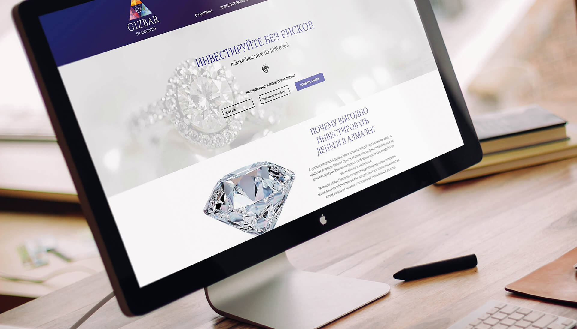 Несмотря на то, что компания Gizbar diamonds работает в достаточно узкой сфере, где конкуренция еще не настолько высокая, выделить себя на рынке они все же захотели. Компания предлагает уникальный способ сохранения сбережений, инвестируя их в алмазы. Для Gizbar diamonds мы разрабатывали логотип, фирменный стиль и сайт. Работа проделана достаточно большая, но началось все с знака — логотип для инвестиционной компании Gizbar diamonds получился особенным.