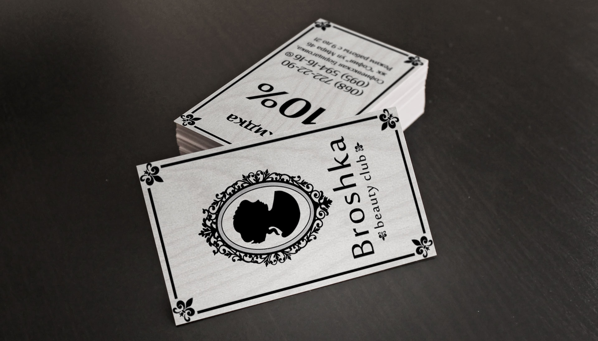 Такий ніжний, жіночний та незвичайний знак ефектно виглядає на багатьох елементах фірмового стилю: на вивісці, декорі салону, на візитних картках. Простий і максимально лаконічний логотип у вінтажному стилі вносить до іміджу салону якусь родзинку, зацікавлює та притягує до себе. З головним завданням, яке стало перед дизайнерами, хлопці впоралися. Вийшов ідеальний фірмовий знак для жіночої студії краси, логотип створює образ надійної та розбирається в питаннях краси студії.