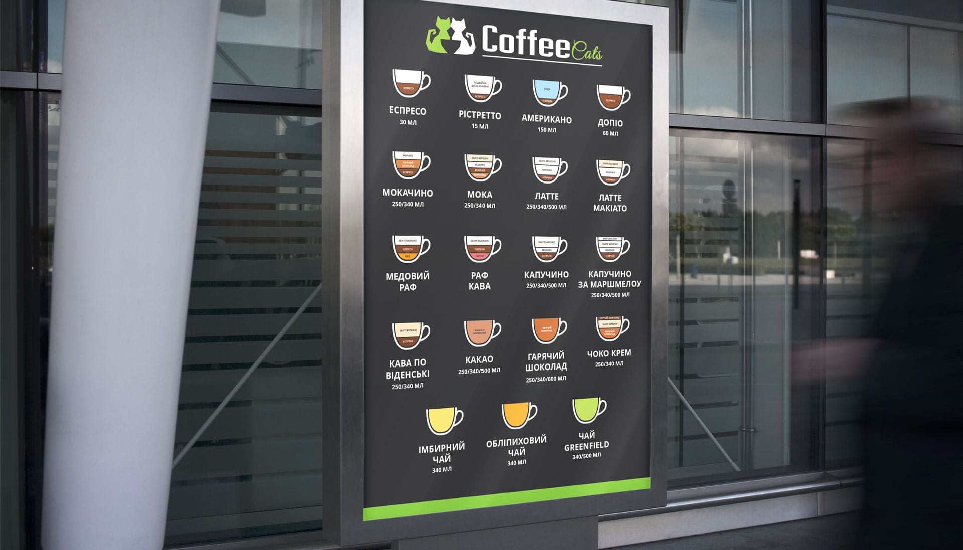 Почнемо з логотипу, адже робота над проектом розпочиналася саме з розробки концепції фірмового знаку. Шукати головні образи довго не довелося, назва кав’ярні підказала і в центрі логотипу ми використали стилізоване зображення двох котиків. Усередині добре проглядається чашка кави, в цілому знак вийшов стильним, лаконічним та простим. Ці якості дозволяють використовувати його на всіх носіях фірмового стилю та, звичайно ж, у брендуванні кав’ярні на колесах.