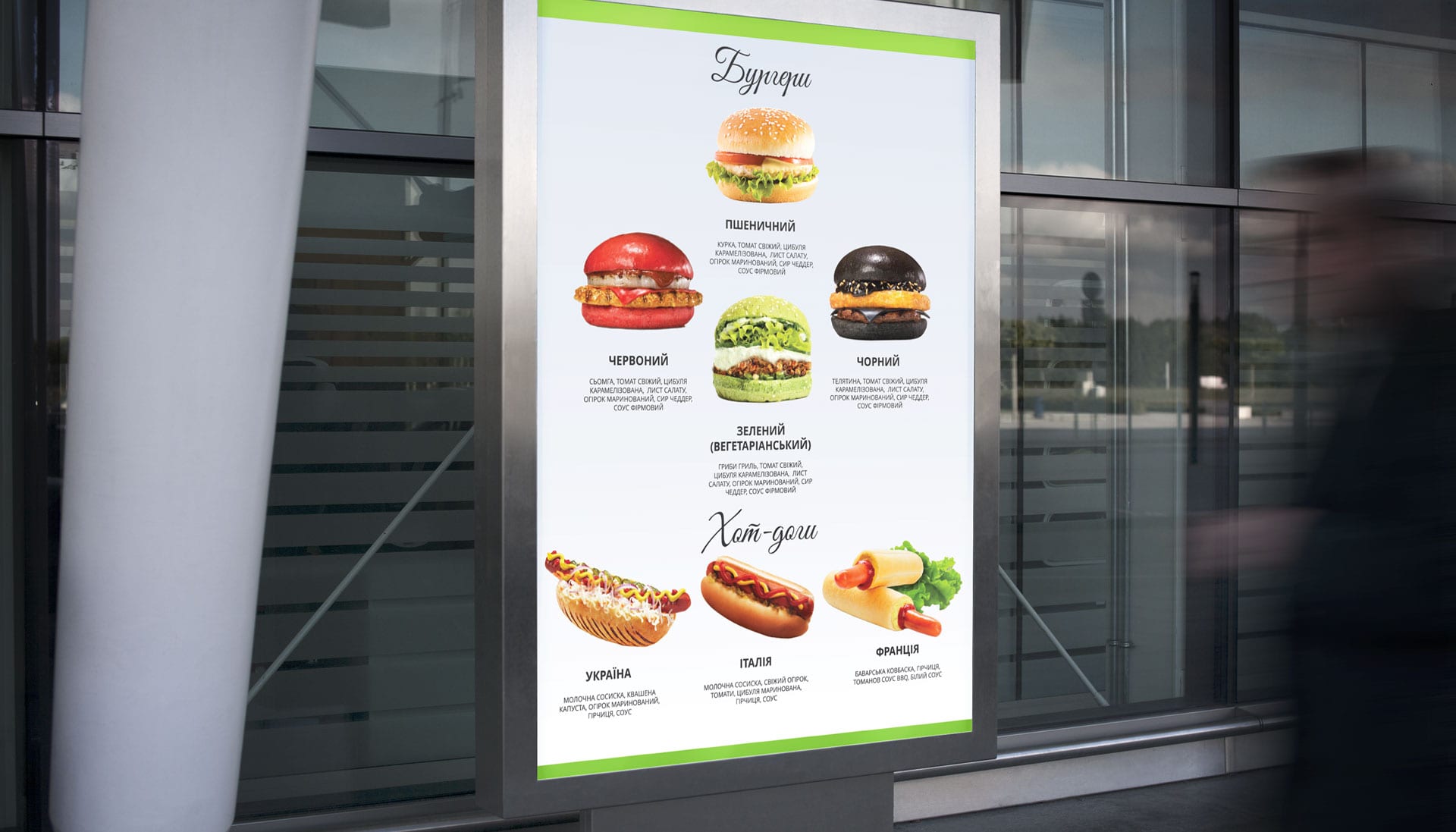 Достатньо стримана, але в той же час цікава вийшла кольорова гама логотипу. Три відтінки: білий, зелений та чорний чудово гармонують і використані і в оформленні меню, і в дизайні самого фургона.