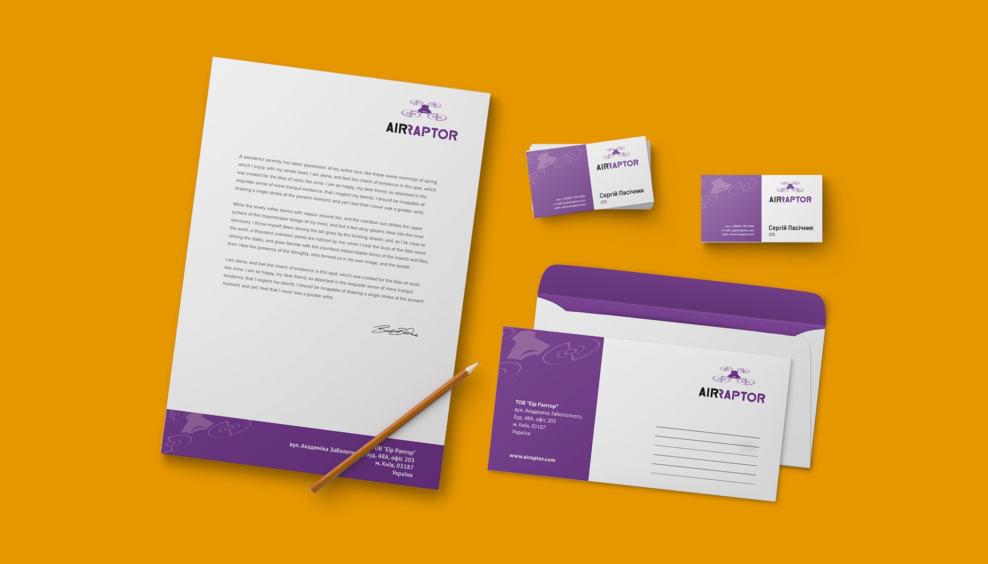 На основі логотипу створено елементи фірмового стилю компанії AirRaptor. У комплект увійшли фірмові бланки, візитні картки, конверти та листи для ділового листування. Всі атрибути іміджу, включаючи логотип, створюють солідний, діловий, професійний стиль компанії.