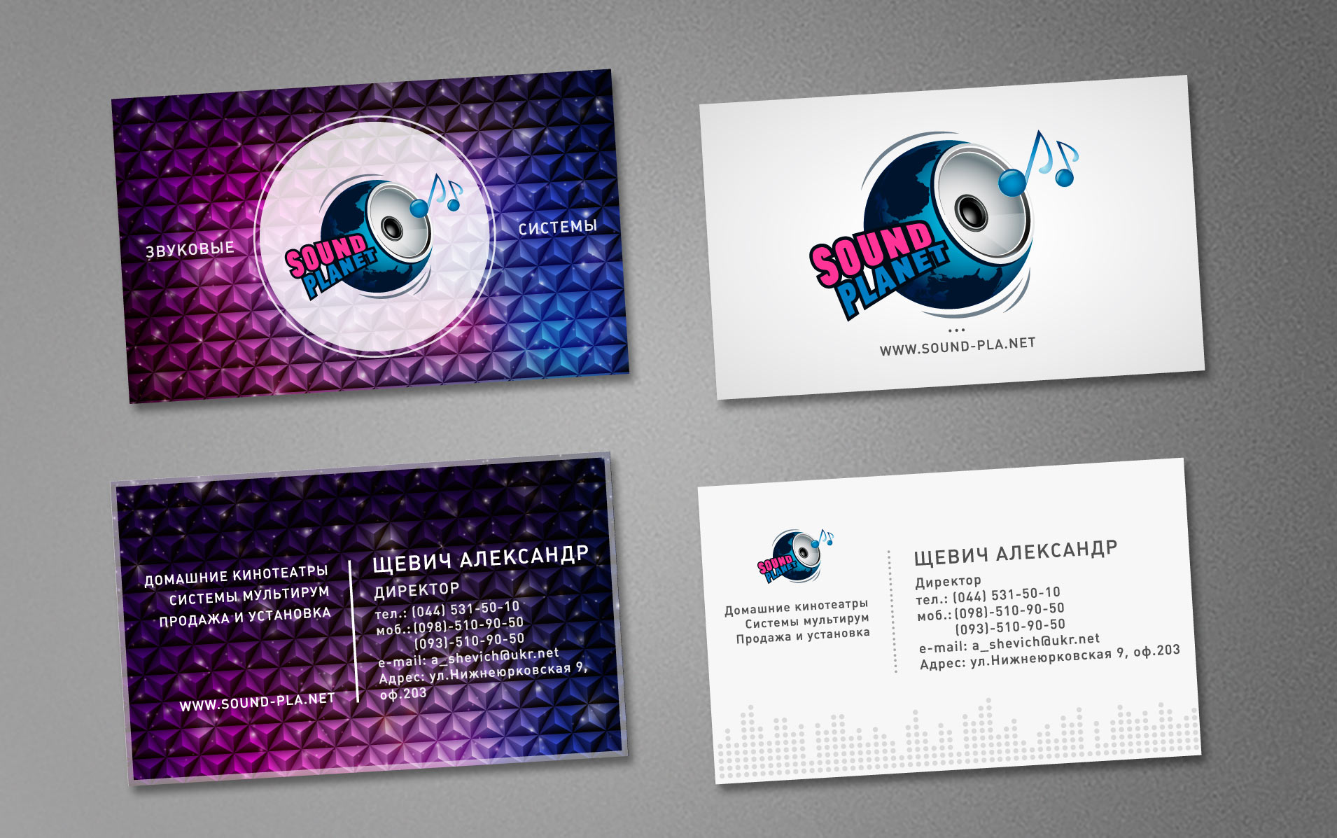 Після затвердження назви магазину ми розпочали розробку логотипу. Ми мали 5 концепцій, одну з яких вибрав замовник, а ми доопрацювали її. Назва магазину дослівно перекладається як планета звуку. Для фірмового знака ми вигадали оригінальну ідею, зобразивши планету у вигляді колонки, яка видає приємні слуху звуки. Створений логотип відрізняється яскравою, яскравою та ефектною подачею інформації. Ми зуміли розробити фірмовий знак, який вдало передає всю палітру емоцій, які отримують від якісного звуку акустичних систем. Після роботи ми зробили макет двосторонніх візиток і надрукували їх.