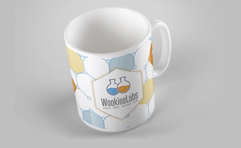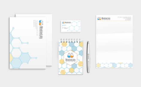 В основу ліг фірмовий знак. Дві колби з вирувальною рідиною відповідають за активний робочий процес, хімічні сполуки – за злагоджений та дружній колектив, який не підведе. Ми розробили повний пакет документації, включаючи візитки, фірмові бланки, конверти та блокноти. Візерунок, логотип та фірмові кольори компанії гармонійно розміщені на документах. А також наші дизайнери максимально грамотно вписали у сувенірну продукцію фірмовий знак. Тепер футболки та чашки з логотипом радуватимуть і клієнтів, і працівників компанії WookieeLabs.