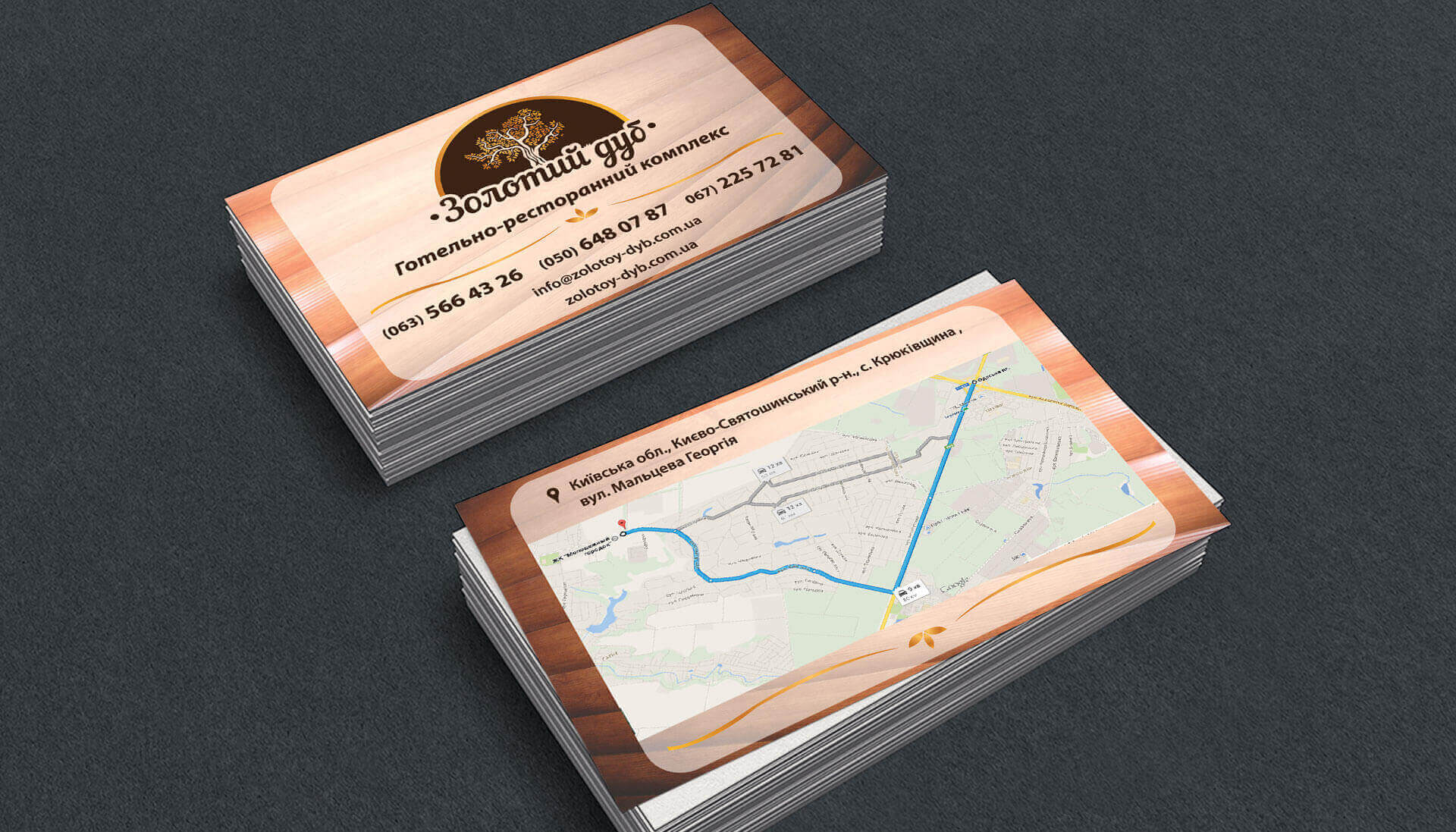Після того, як ми остаточно затвердили логотип, наші спеціалісти розробили дизайн візиток для комплексу «Золотий дуб». Фірмовий знак виглядає досить органічно усім елементах фірмового стилю, зокрема і візитних картках. Ресторан та готель в одній особі знайшов імідж елітного закладу. Логотип чудово виглядає на елементах фірмового стилю, на вивисці, в інтер’єрі закладу.